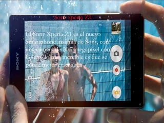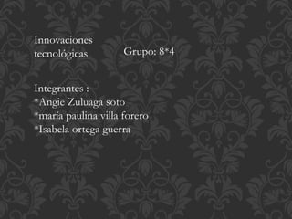 El documento describe varias innovaciones tecnológicas como el Sony Xperia Z1, la cámara Polaroid Socialmatic, el reloj inteligente Pebble, impresoras 3D, dinero móvil, pantallas flexibles, dispositivos para el deporte, un tatuaje temporal para medir los niveles de azúcar en la sangre, y un nuevo material que repele el agua.