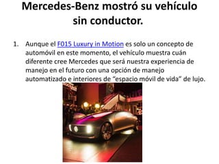 El documento resume varias innovaciones tecnológicas presentadas en el CES 2015, incluyendo un vehículo sin conductor de Mercedes-Benz, dispositivos controlados por gestos, un brazo robótico que jugó pong de cerveza, y un robot asistente de Toshiba diseñado para el cuidado de la salud. También describe un cinturón inteligente que se ajusta dependiendo de la comida ingerida, cargadores superrápidos para teléfonos, y un tatuaje temporal que mide los niveles de azúcar en la