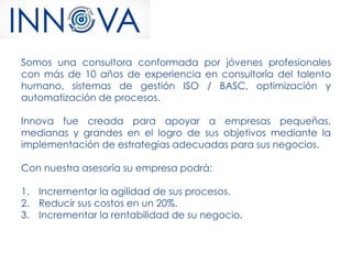 Innova es una consultora conformada por jóvenes profesionales con más de 10 años de experiencia en consultoría de talento humano, sistemas de gestión ISO y BASC, y optimización de procesos. Ofrecen servicios de asesoría para incrementar la agilidad y rentabilidad de negocios de pequeñas, medianas y grandes empresas a través de la implementación de estrategias adecuadas.