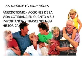 El documento describe diferentes enfoques tradicionales de enseñanza de la historia como el anecdotismo, el heroicismo, las efemérides y el cronologismo, que pueden limitar el razonamiento crítico. También menciona enfoques problemáticos como el dogmatismo, el verbalismo y el maniqueísmo. El objetivo de la historia, según el texto, es orientar el trabajo docente con una perspectiva social y filosófica fundamentada científicamente.