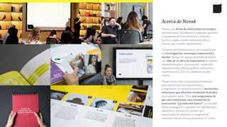 El documento es un folleto de un taller de innovación organizado por Novak, una firma de innovación estratégica. El taller se llevará a cabo el 9 de mayo de 2019 en WeWork Calle 81 en Bogotá y se centrará en tres temas principales: pasar de la innovación sesgada a la significativa, del valor convencional al disruptivo, y de soluciones débiles a robustas. El taller de dos horas enseñará principios y herramientas de innovación centrada en las personas y enfocada en experiencias.
