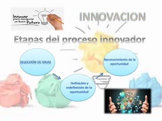 El documento define la innovación como la implementación exitosa de nuevas ideas, productos, servicios o procesos en el mercado. Explica que una innovación requiere no solo inventar algo nuevo sino también introducirlo con éxito en el mercado para que la gente lo conozca y pueda disfrutar de ello. Además, señala que la creatividad es una fuente importante de innovación pero no es suficiente por sí sola, ya que la innovación es un proceso complejo que requiere límites.