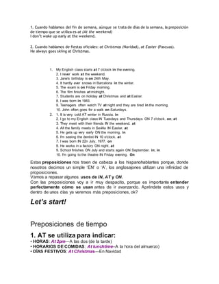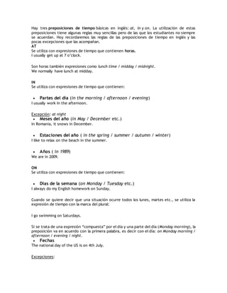 El documento explica las tres preposiciones de tiempo básicas en inglés - at, in y on - y sus usos. At se usa con horas, partes del día como midday, y días festivos. In se usa con partes del día como morning, meses, estaciones y años. On se usa con días de la semana y fechas específicas. Hay algunas excepciones como usar at en lugar de in para el fin de semana y días festivos como Christmas y Easter.