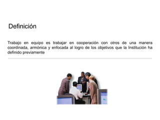 Trabajar en equipo implica cooperar de manera coordinada y armoniosa para lograr los objetivos de la institución. Los equipos pueden ser formales o informales, y están clasificados según su estructura, como de mando, tarea, interés o amistad. Para funcionar efectivamente, los equipos deben tener objetivos claros, afrontar conflictos de manera constructiva, y evaluar continuamente su desempeño a través de las distintas etapas de formación, conflicto, regulación, desempeño y posible desintegración.