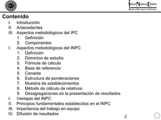 El documento describe los aspectos metodológicos del Índice Nacional de Precios al Consumidor (INPC) de Venezuela. Explica que el INPC mide los cambios mensuales en los precios de una canasta de 362 bienes y servicios representativos del consumo nacional. Usa una fórmula de tipo Laspeyres con diciembre de 2007 como base de referencia. Cubre 10 áreas metropolitanas, 74 localidades adicionales y el resto del país. Su objetivo es proporcionar un indicador de inflación con mayor cobertura geográfica que