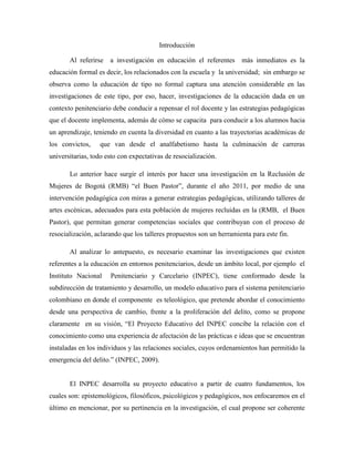El documento describe una investigación sobre estrategias pedagógicas para generar competencias sociales en mujeres recluidas en la Reclusión de Mujeres de Bogotá "El Buen Pastor". El objetivo es mejorar las competencias sociales de 30 mujeres entre 18 y 50 años que hacen parte de un grupo terapéutico, a través de talleres de artes escénicas. Se justifica la investigación argumentando que la educación puede producir un cambio en la vida de las reclusas y reconstruir sus proyectos de vida.