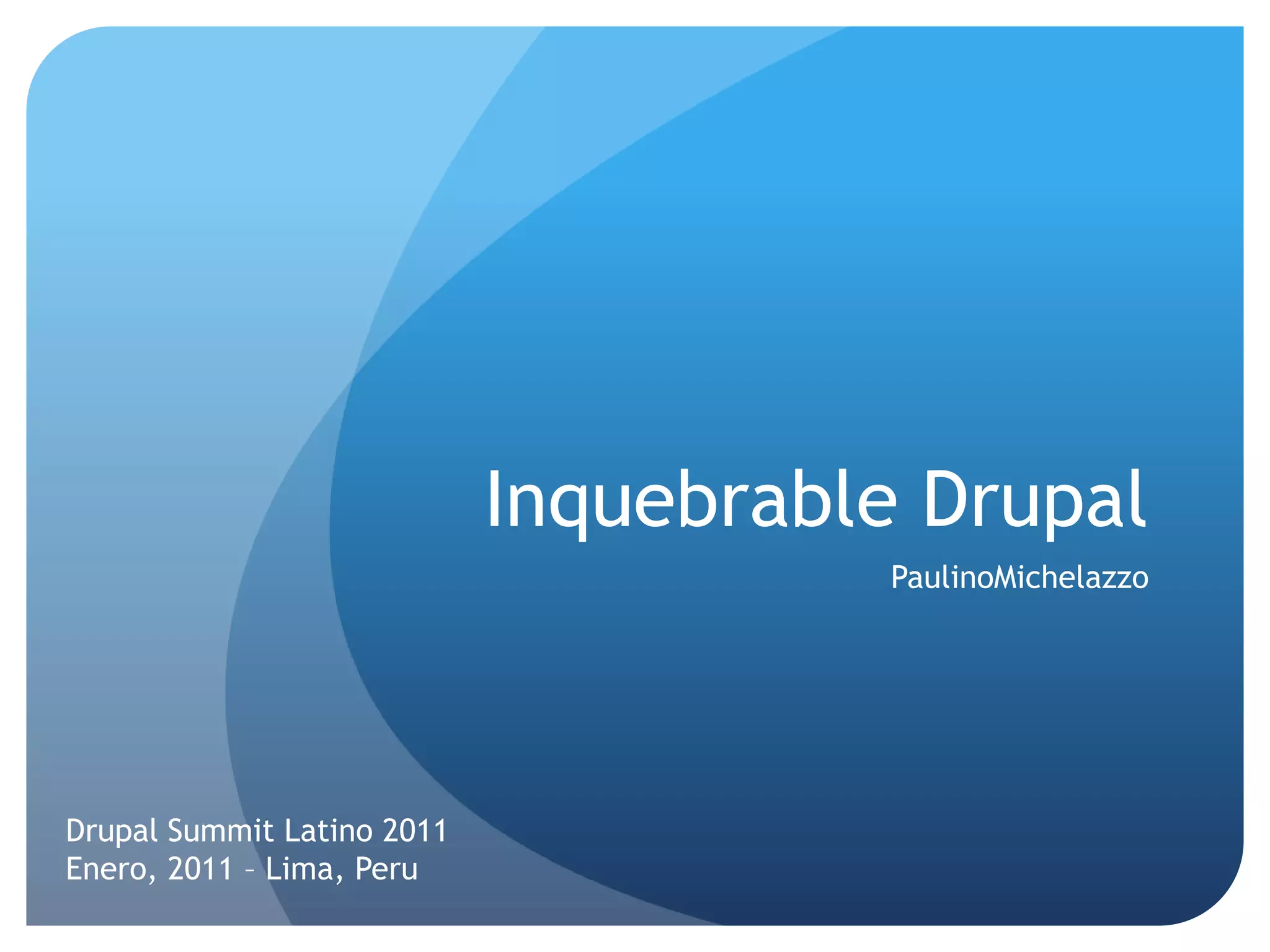 Este documento resume las principales consideraciones de seguridad para Drupal. Primero, explica los diferentes tipos de ataques como ataques sociales, físicos y digitales que deben prevenirse. Luego, recomienda configuraciones básicas de seguridad para la instalación, como no usar el usuario superadministrador y restringir permisos de archivos. Finalmente, menciona módulos adicionales para mejorar la seguridad de inicio de sesión, contraseñas y herramientas de escaneo. El objetivo es crear con