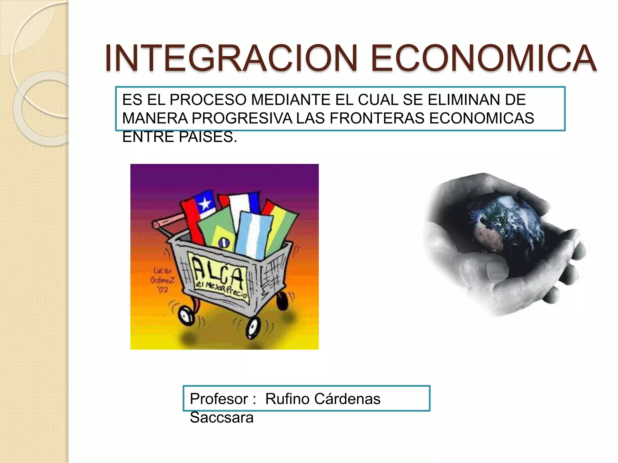 El documento describe los conceptos de integración económica y diferentes formas de integración como zonas de libre comercio, uniones aduaneras y mercados comunes. Explica las etapas de la integración económica y presenta varios ejemplos de bloques económicos regionales como la Unión Europea, la Comunidad Andina, Mercosur, CARICOM y APEC.
