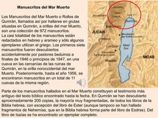 Los Manuscritos del Mar Muerto, hallados en Qumrán, son una colección de 972 textos antiguos que incluyen fragmentos de la Biblia hebrea, constituyendo el testimonio más antiguo del texto bíblico conocido. Estos manuscritos han cambiado la comprensión del canon del Antiguo Testamento y su autenticidad, mostrando un notable respeto a los detalles originales. Además, el documento discute las versiones de la Biblia y los diferentes arreglos de las escrituras entre judíos y cristianos en la antigüedad.