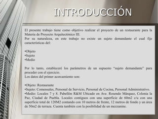 Este documento presenta un proyecto arquitectónico para diseñar un restaurante casual. Incluye una breve historia de los restaurantes, una clasificación de diferentes tipos de restaurantes según factores como el precio y la experiencia ofrecida, y establece las soluciones de diseño, metas y objetivos para el proyecto, que incluyen crear un restaurante clasificado como casual con espacios agradables para aproximadamente 44 comensales.
