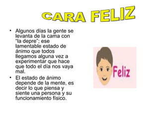 El documento habla sobre los estados de ánimo y cómo estos dependen de la mente y el cuerpo. Explica que los pensamientos y emociones se expresan a través del cuerpo y que la mente puede cambiar rápidamente de estado de ánimo. También menciona que recuerdos placenteros del pasado pueden ayelar a levantar el estado de ánimo cuando nos levantamos con el pie izquierdo.