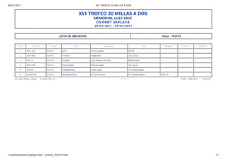 Este documento presenta una lista de 6 embarcaciones inscritas en la clase Platu para el XVI Trofeo 30 Millas a Dos Memorial Luis Saiz que se celebrará los días 29 y 30 de enero de 2011 en el Club Náutico Port Saplaya. La lista incluye el número de vela, el nombre de la embarcación, el armador y el club de cada una de las embarcaciones participantes.
