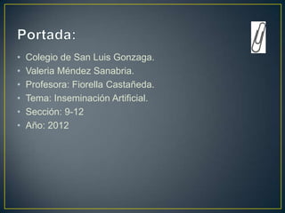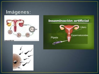 La inseminación artificial consiste en el depósito de espermatozoides en la mujer de manera no natural mediante instrumental especializado para lograr un embarazo. Existen dos tipos: con semen de la pareja o de un donante. Implica estimular la ovulación, recolectar y preparar el semen, y depositarlo en el momento adecuado. Aunque es segura, tiene riesgos como estimulación ovárica excesiva o embarazos múltiples.