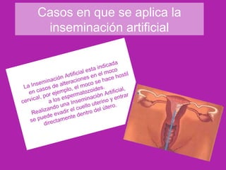 El documento describe diferentes casos en los que se aplica la inseminación artificial, incluyendo cuando el hombre tiene anticuerpos contra su propio semen, cuando no puede eyacular dentro de la vagina, cuando el semen se eyacula dentro de la vejiga en lugar del pene, y cuando hay ausencia total de espermatozoides. También describe diferentes tipos de inseminación artificial como la intrauterina, intravaginal e intracervical.