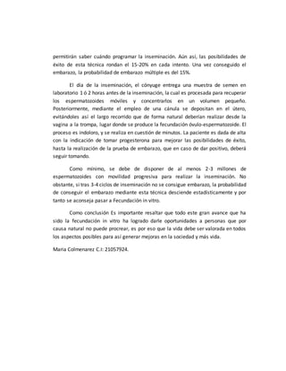 La inseminación artificial tiene antecedentes desde el siglo XV, cuando un médico judío introdujo el semen del rey Enrique IV de Castilla en el cuerpo de su esposa la reina Juana de Portugal. Actualmente, la inseminación artificial es un procedimiento de fertilidad que permite el embarazo de parejas que enfrentan infertilidad y de parejas del mismo sexo, evaluando y seleccionando los espermatozoides para reducir la transmisión de trastornos genéticos. El proceso involucra la recolección de semen, la selección de los esper