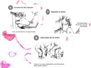 Este documento describe el proceso de inseminación artificial en diferentes especies animales. Explica brevemente los antecedentes históricos de la inseminación artificial, las ventajas y desventajas de su uso, el equipo necesario, y los pasos para realizar la inseminación rectocervical en vacas.