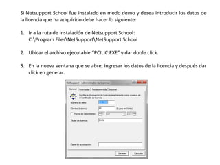 Para activar la licencia de NetSupport School después de una instalación de demostración, el usuario debe ejecutar el archivo PCILIC.EXE en la carpeta de instalación de NetSupport School, ingresar los datos de la licencia adquirida y generar la licencia.