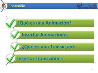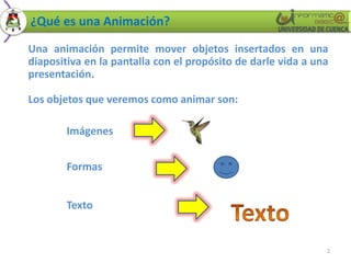 Este documento explica qué son las animaciones en PowerPoint y cómo insertarlas. Define una animación como algo que permite mover objetos en una diapositiva para darle vida a una presentación. Luego describe cómo animar imágenes, texto y formas seleccionando el objeto, eligiendo una animación personalizada y trazando el movimiento deseado. Finalmente, muestra cómo animar un texto y una forma aplicando efectos de entrada y énfasis.