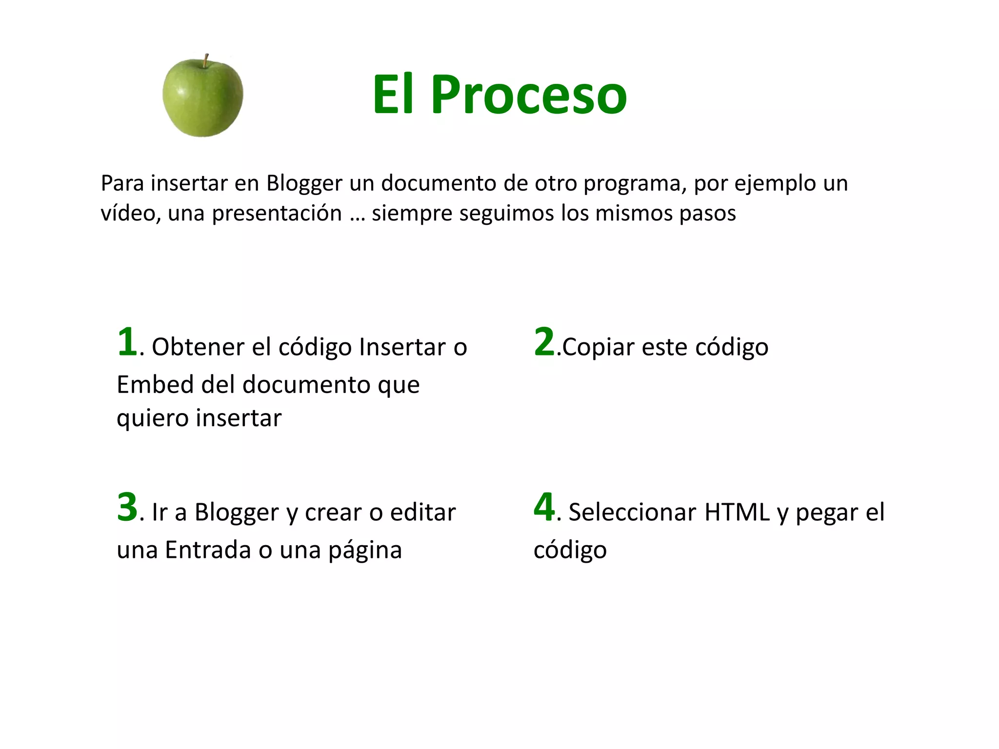 El documento proporciona instrucciones para insertar diferentes tipos de documentos en Blogger, incluyendo presentaciones, videos y documentos de Google Docs. Siguiendo los pasos provistos, uno debe obtener el código de inserción del documento, pegarlo en una entrada de Blogger usando la opción HTML, y publicar la entrada.