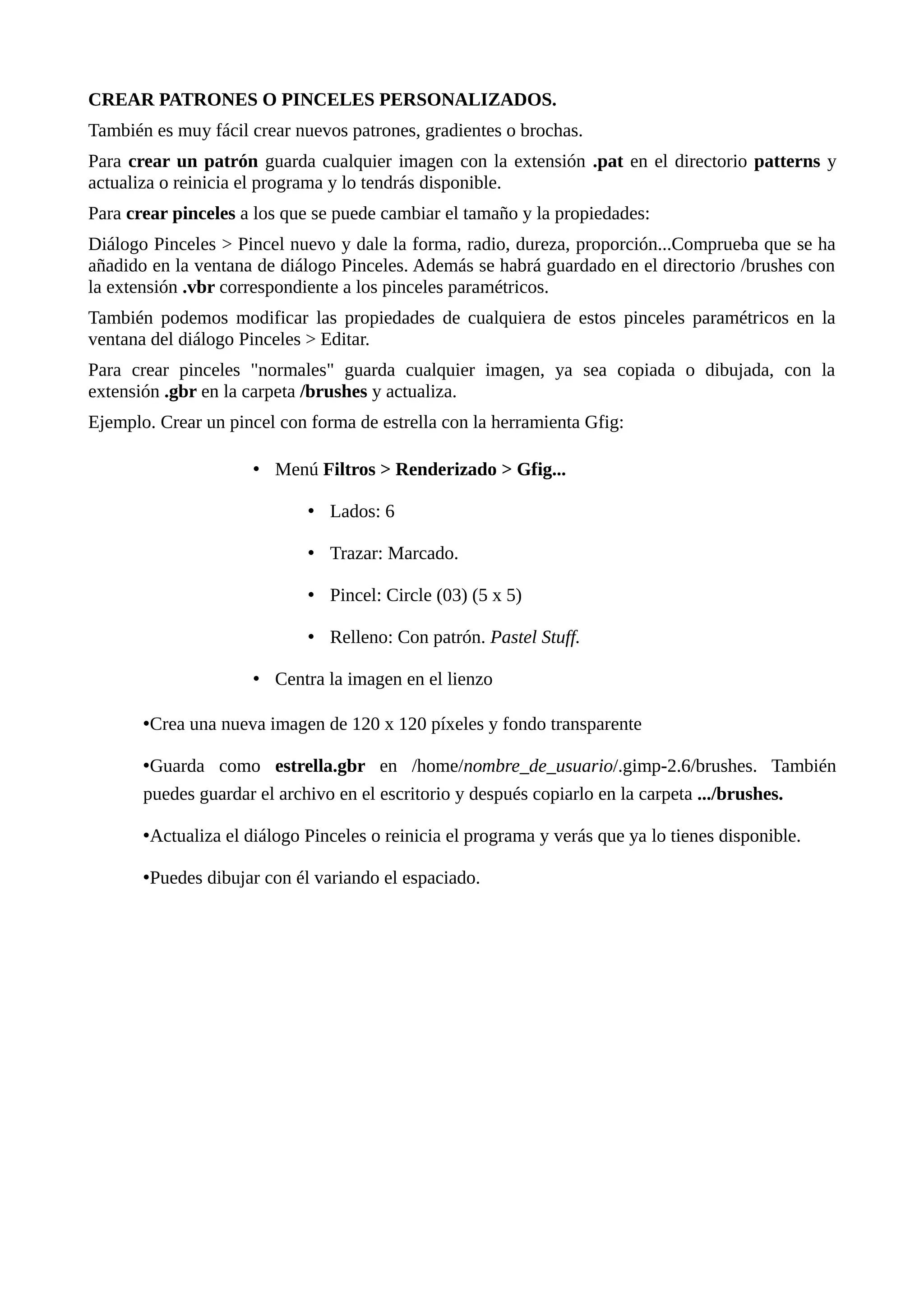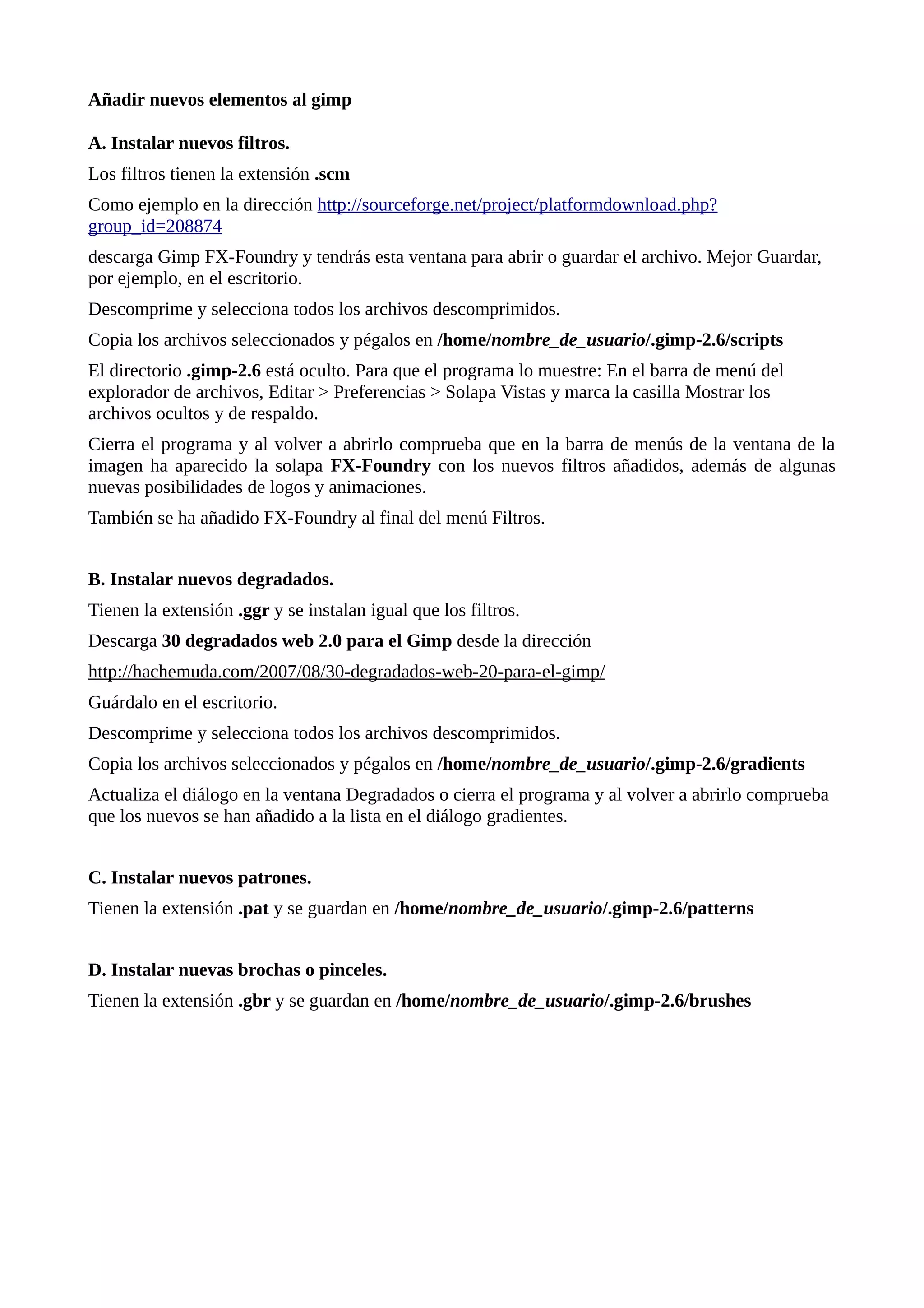 Este documento describe cómo añadir nuevos elementos como filtros, degradados, patrones y pinceles al programa GIMP. Los filtros y degradados tienen extensiones .scm y .ggr respectivamente y se instalan copiándolos en la carpeta scripts o gradients del directorio de usuario de GIMP. Los patrones y pinceles tienen extensiones .pat y .gbr y se instalan copiándolos en las carpetas correspondientes del directorio de usuario. También es posible crear elementos personalizados guardando imágenes con las extensiones adecuadas en esas carpetas.