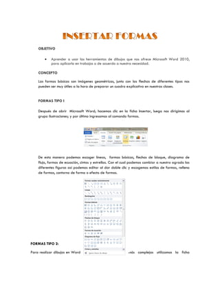 El documento describe cómo usar las herramientas de dibujo en Microsoft Word 2010 para crear gráficas y cuadros explicativos. Explica que se pueden insertar formas básicas como líneas y figuras geométricas desde la pestaña Insertar > Ilustraciones > Formas y personalizar sus estilos, rellenos y contornos. También muestra cómo crear dibujos más complejos usando la opción "Nuevo lienzo de dibujo" que proporciona un margen para diseñar imágenes.