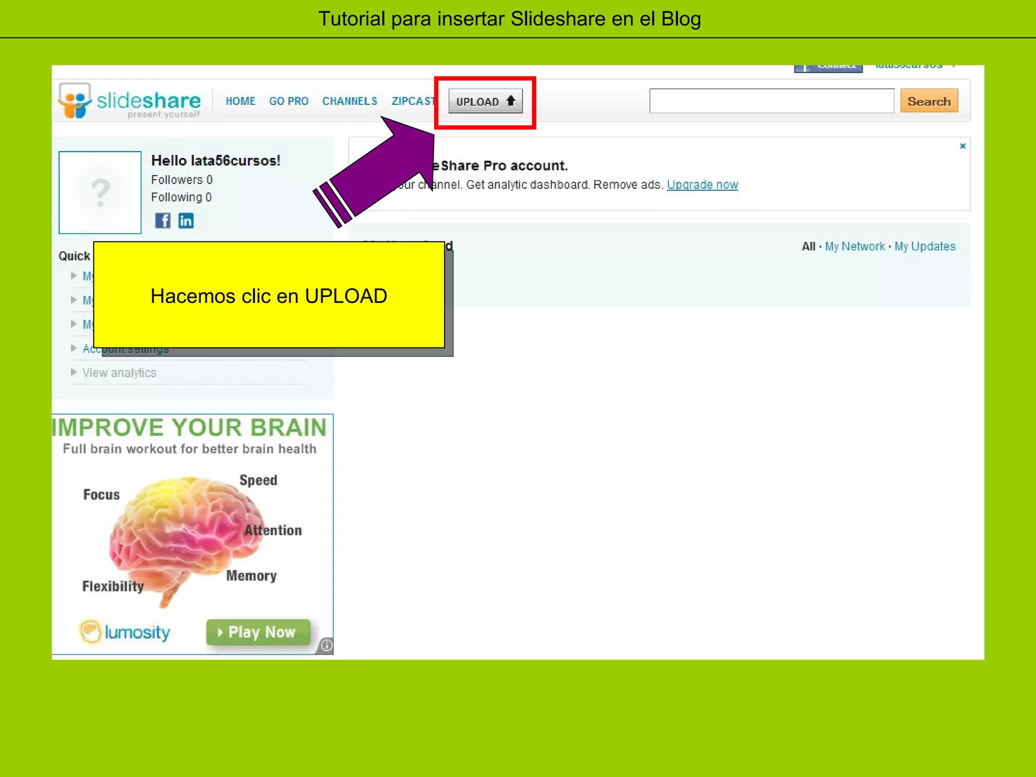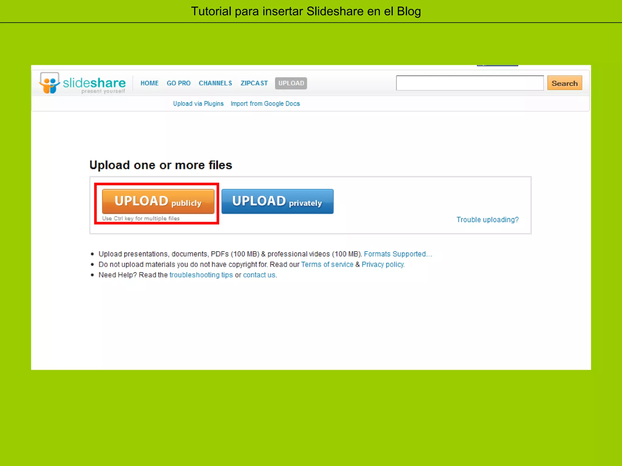 El documento describe los pasos para subir una presentación PowerPoint o documento a SlideShare y luego insertarlo en un blog usando el código embed. Estos pasos incluyen iniciar sesión en SlideShare, seleccionar el archivo para subir, completar la información requerida, copiar el código embed generado y pegarlo en la entrada del blog en modo edición HTML.