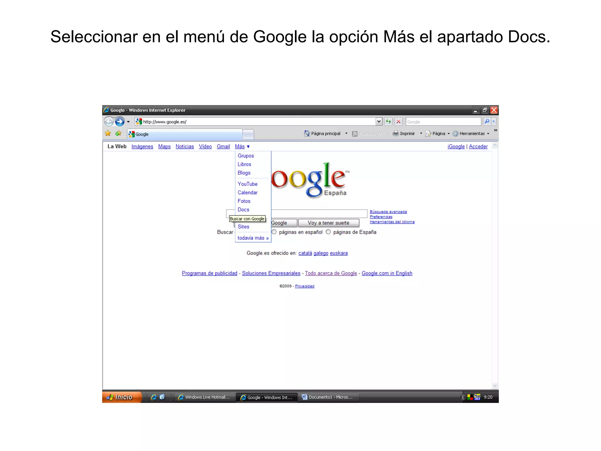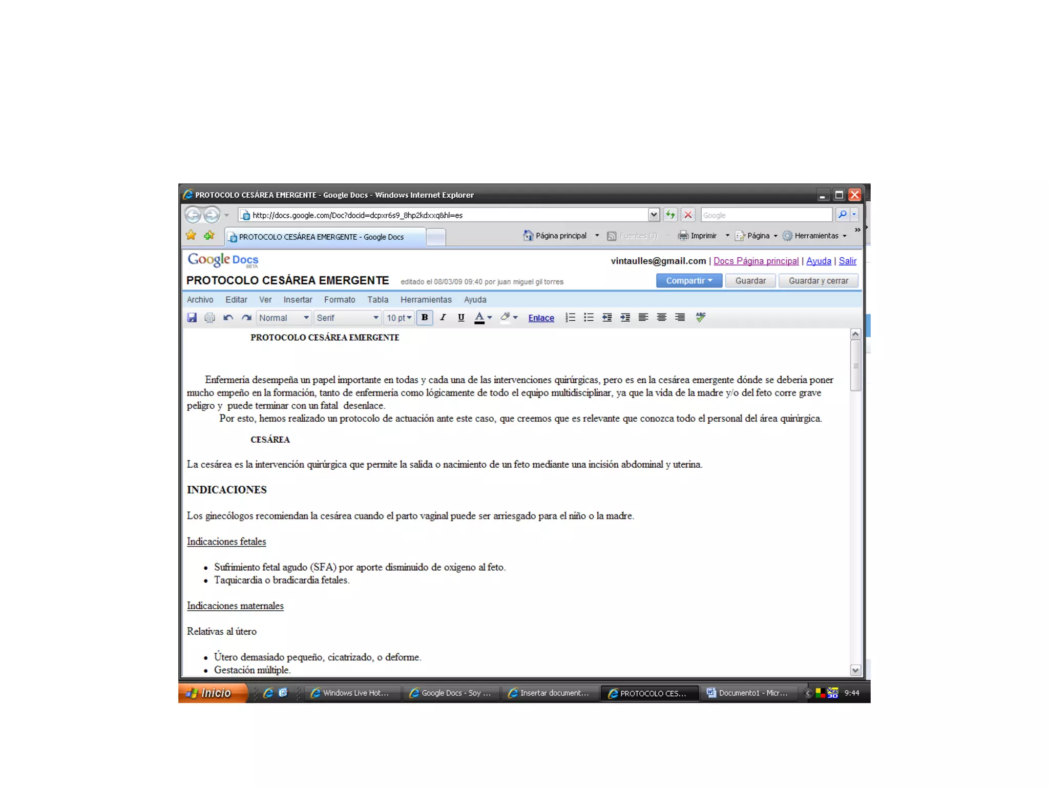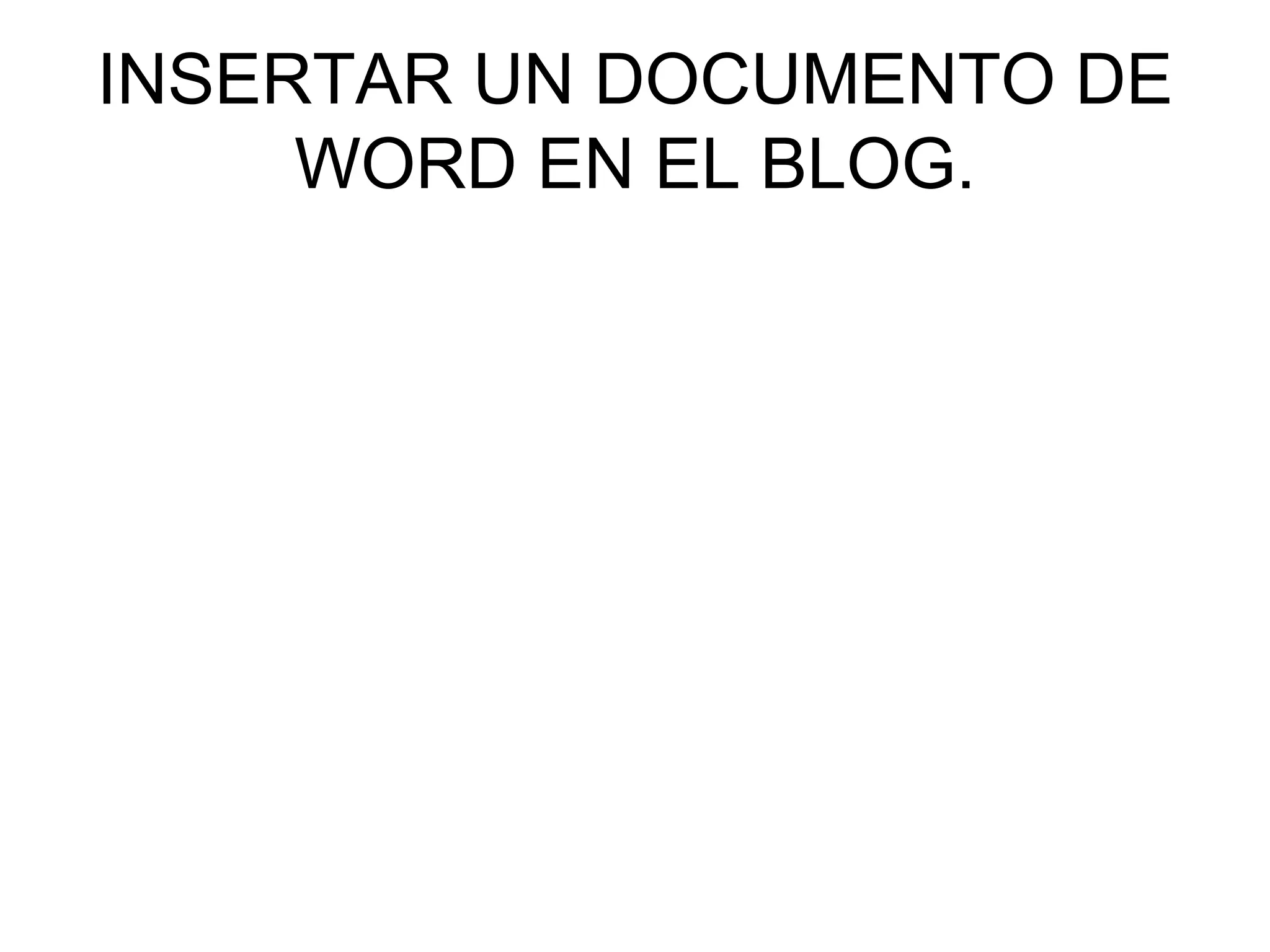 Este documento explica cómo insertar un documento de Word en un blog de Google. Primero se selecciona la opción "Docs" en el menú de Google y se accede a la cuenta de Gmail. Luego se crea un nuevo documento y se escribe el texto, guardándolo y cerrándolo una vez terminado. Finalmente, se edita el HTML del documento y se copia el código en una nueva entrada de blog para publicarlo con el documento insertado.