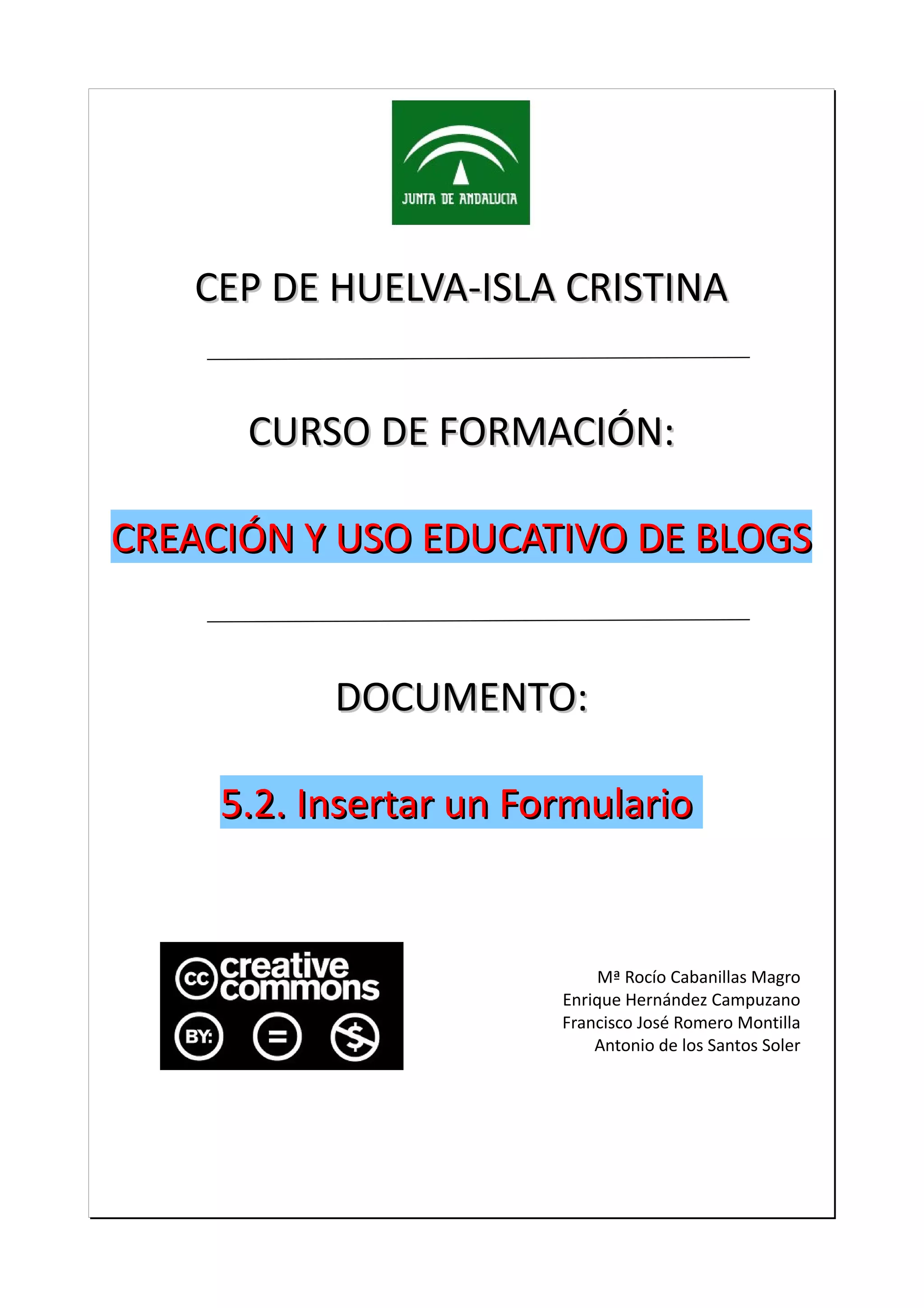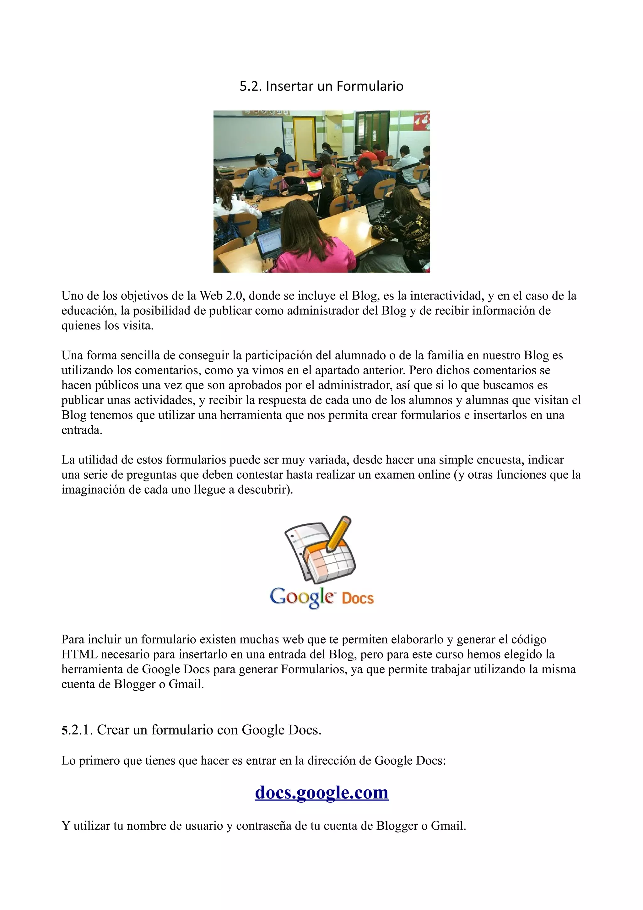 Este documento describe cómo crear y insertar formularios interactivos en blogs educativos utilizando Google Docs. Explica cómo crear un formulario en Google Docs con diferentes tipos de preguntas como texto, opción múltiple y verdadero/falso. Luego, muestra cómo copiar el código HTML del formulario e insertarlo en una entrada de blog, y finalmente cómo acceder a las respuestas del formulario en Google Docs.