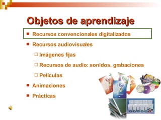 Objetos de aprendizajeRecursos convencionales digitalizados Recursos audiovisuales Imágenes fijas Recursos de audio: sonidos, grabaciones Películas Animaciones Prácticas