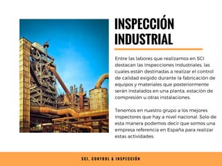 SCI se especializa en inspecciones industriales para el control de calidad durante la fabricación de equipos y materiales destinados a instalaciones industriales, contando con un equipo de inspectores altamente calificados. Ofrecen una variedad de servicios que incluyen la supervisión de fabricación, inspecciones finales y pruebas no destructivas, además de revisar los procedimientos de fabricación para garantizar el cumplimiento de los requisitos de proyectos. SCI también dispone de inspectores certificados API 653 para garantizar la calidad en la inspección de tanques de almacenamiento en servicio, enfatizando la importancia de prácticas adecuadas para prevenir riesgos materiales y ambientales.