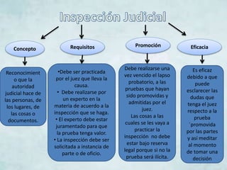La inspección judicial es el reconocimiento que hace un juez experto de personas, lugares, cosas o documentos a petición de las partes o por iniciativa propia. Requiere que el experto esté juramentado y que la inspección se realice una vez finalizado el período probatorio sobre elementos no protegidos legalmente. Su eficacia radica en que permite esclarecer las dudas del juez sobre otras pruebas para tomar una decisión fundamentada.