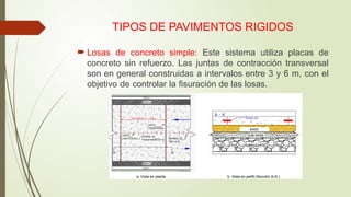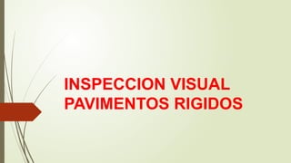 El documento describe los tipos de pavimentos rígidos, como losas de concreto simple, reforzado y continuamente reforzado, así como los daños comunes que pueden sufrir, entre los que se incluyen diversas clases de grietas y deterioros en juntas. Se detallan las causas y posibles intervenciones para cada tipo de daño, clasificando la severidad de los deterioros y los métodos de medición. También se abordan problemas específicos relacionados con la geometría de los pozos y sumideros que afectan la integridad del pavimento.