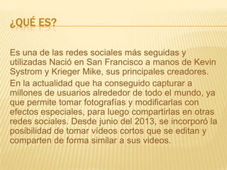 Instagram es una red social para compartir fotos. Se creó en 2010 y permite a los usuarios tomar fotos, aplicar filtros digitales y compartirlas en otras redes. Ha crecido rápidamente, alcanzando cientos de millones de usuarios en todo el mundo. En 2012, Facebook compró Instagram por mil millones de dólares.