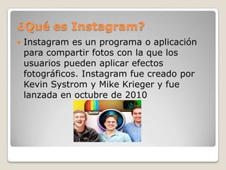 Instagram es una aplicación para compartir fotos lanzada en 2010. Los usuarios pueden tomar fotos cuadradas, aplicar varios filtros retro y compartirlas en otras redes sociales. La aplicación también permite videos cortos y la edición de fotos con marcos y colores. Los hashtags populares incluyen #selfie, #sunset y #love.