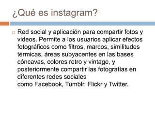 Instagram es una red social y aplicación para compartir fotos y videos lanzada en 2010. Los usuarios pueden aplicar filtros y efectos a sus fotos antes de compartirlas en otras redes sociales como Facebook y Twitter. La aplicación ganó rápidamente popularidad, alcanzando 100 millones de usuarios en 2012 y superando los 300 millones en 2014. Instagram ha revolucionado la forma en que las personas comparten y consumen fotos online.