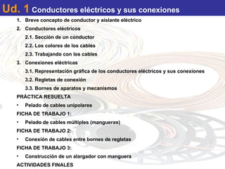Este documento trata sobre conductores eléctricos y sus conexiones. Explica diferentes tipos de conductores, como flexibles, rígidos y mangueras de varios conductores. También describe cómo trabajar con cables, incluyendo cortarlos y pelarlos. Finalmente, cubre conexiones eléctricas como regletas y bornes, y tres fichas de trabajo prácticas sobre pelado de cables, conexión entre bornes y construcción de un alargador.