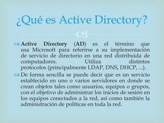 Este documento describe qué es Active Directory y cómo instalarlo. Active Directory es el servicio de directorio de Microsoft que almacena objetos como usuarios, equipos y grupos para administrar inicios de sesión y políticas de red. Antes de instalar AD, hay que decidir el nombre de dominio y DNS. La instalación se realiza desde el Server Manager agregando el rol de "Active Directory Domain Services", luego de lo cual se completa la instalación y AD queda configurado.