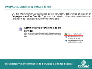 El documento describe los 10 pasos para instalar y configurar el Directorio Activo en un servidor Windows 2003, que incluyen agregar la función de servidor DNS, seleccionar una configuración típica de servidor principal, especificar el nombre de dominio DNS y NETBIOS, iniciar la instalación de Active Directory y DNS, y completar la configuración para que el servidor funcione como Controlador de Dominio con Active Directory, Servidor DNS y Servidor DHCP.