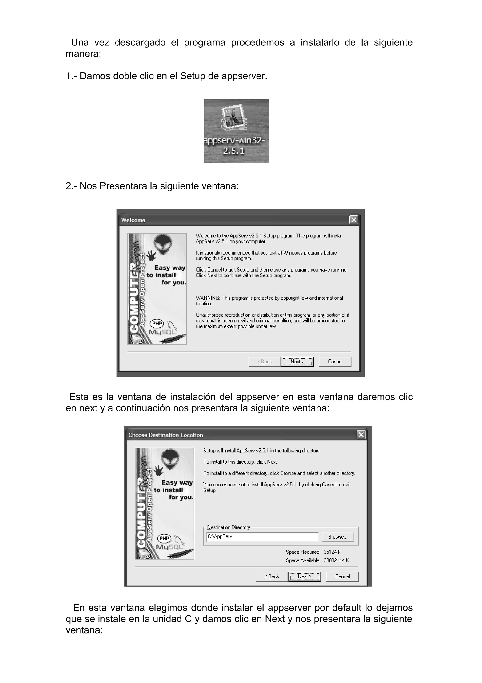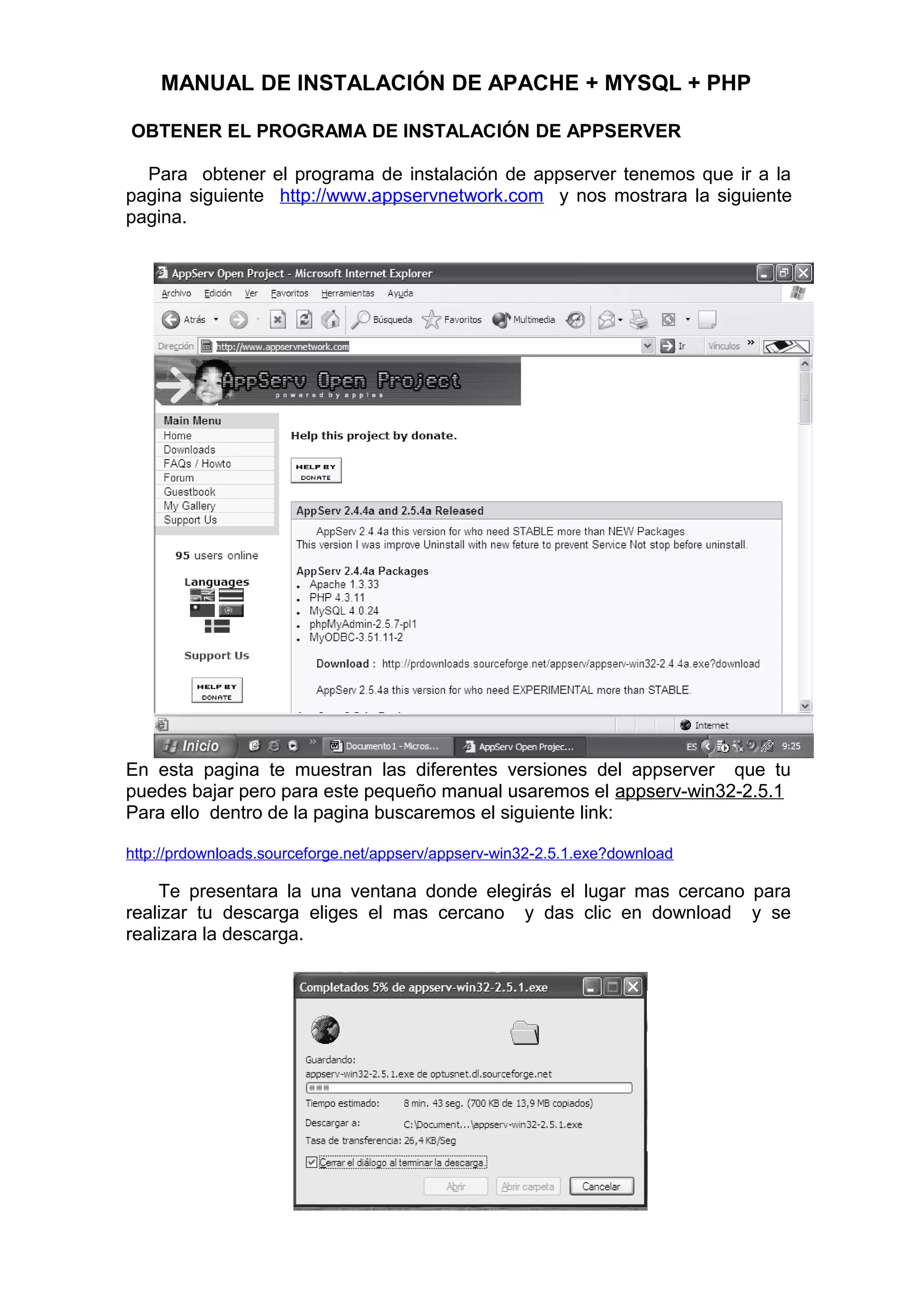 Este documento proporciona instrucciones para instalar Apache, MySQL y PHP en Windows. Explica cómo descargar e instalar el paquete AppServ Network, seleccionar la opción de instalación personalizada para instalar los servidores Apache y MySQL junto con PHP y PhpMyAdmin. Una vez instalado, verifica que Apache, MySQL y PHP funcionan correctamente accediendo a las páginas de información proporcionadas.