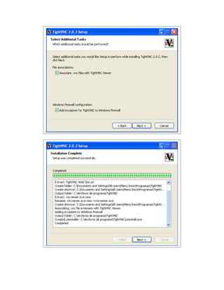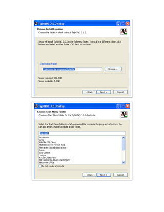 El documento proporciona instrucciones para descargar e instalar el programa TightVNC Viewer en una computadora para conectarse de forma remota a una laptop XO de Primaria utilizando su dirección IP. Explica los pasos para ejecutar el instalador de TightVNC, ingresar la dirección IP de la laptop XO en el programa, conectarse para ver su escritorio remoto y ajustar el zoom si es necesario antes de cerrar la conexión.