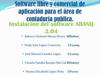 El documento presenta la instalación de software contable ABANQ 2.04 para cinco contadores públicos: Rebecca Nohemí Moran Rivera, Fredy Iván López Contreras, José Manuel Canales López, Claudia Natalia Rosales Del Cid y Norma Elizabeth López Peña.