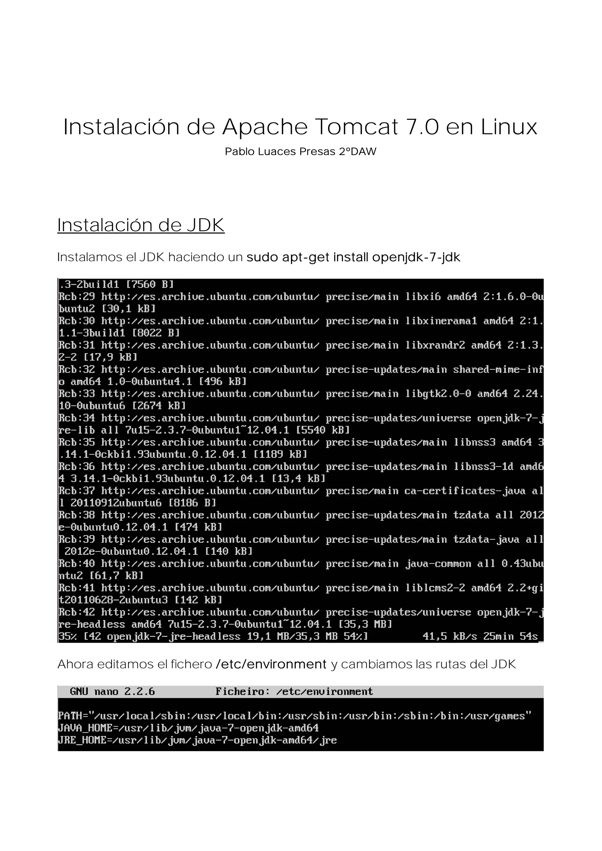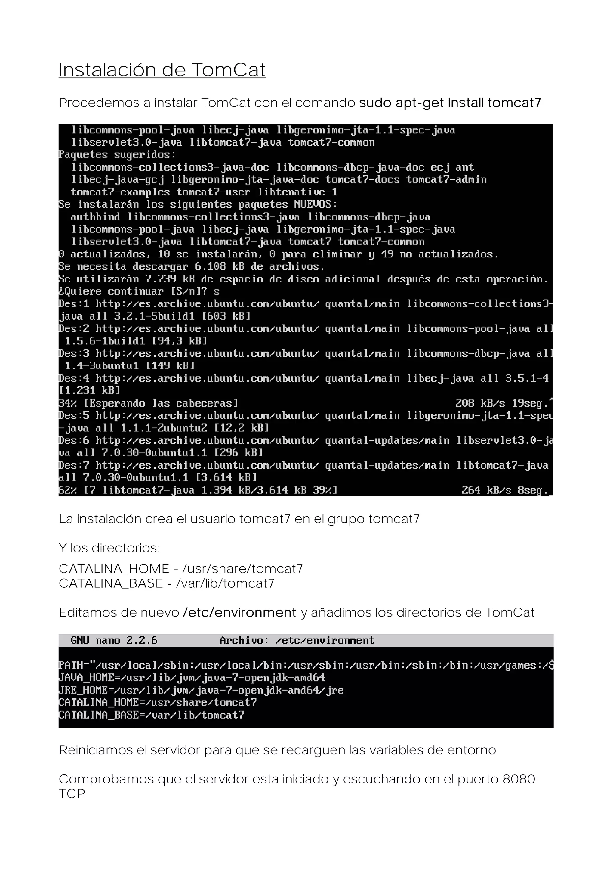 Este documento describe los pasos para instalar Apache Tomcat 7 en Linux. Inicialmente se instala el JDK y se editan las variables de entorno. Luego se instala Tomcat y se comprueba que el servidor está escuchando en el puerto 8080. Finalmente se instalan ejemplos y documentación y se configura la integración con Eclipse.
