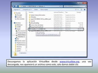 El documento describe los pasos para instalar VirtualBox. Se descarga la aplicación desde el sitio web de VirtualBox, se ejecuta el instalador y se siguen los pasos guiados para configurar la instalación, incluyendo la ruta de instalación y opciones de accesos directos. Finalmente, se completa la instalación y se abre VirtualBox para ver la interfaz.