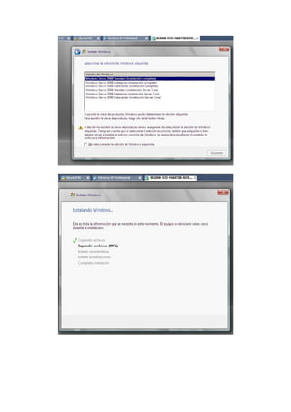 El documento detalla el proceso de instalación y configuración de Windows Server 2008, incluyendo requisitos mínimos, creación de una máquina virtual en VMware, y la instalación del sistema operativo. También se describe la configuración inicial, la verificación del estado de los dispositivos, la toma de snapshots, y la instalación del servicio Terminal Server. Finalmente, se menciona la activación del sistema operativo y las diferencias entre el Terminal Server y el escritorio remoto.
