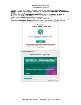 Este documento proporciona instrucciones en 4 pasos para instalar el programa Kaspersky Internet Security: 1) Ejecutar el archivo de instalación descargado, 2) Aceptar los términos del acuerdo de licencia, 3) Permitir que la aplicación se instale, y 4) Hacer clic en Finalizar para completar la instalación. También recomienda participar en la red de seguridad de Kaspersky para recibir protección óptima, pero no es obligatorio.