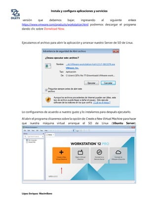 El documento describe los pasos para instalar el sistema operativo Ubuntu Server versión 17.04 en una máquina virtual usando el programa VMware Workstation. Primero se debe descargar el ISO de Ubuntu Server y VMware Workstation, luego crear una nueva máquina virtual en VMware Workstation usando la imagen ISO descargada, e instalar y configurar Ubuntu Server siguiendo los pasos del asistente de instalación.