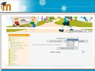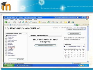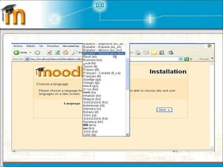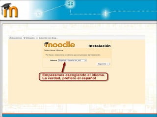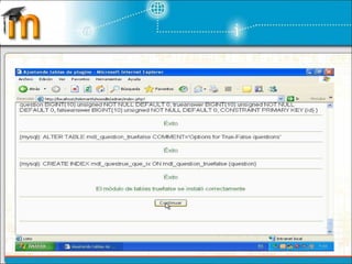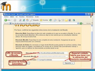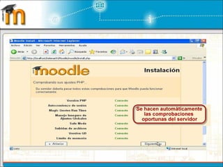 El documento describe lo que es una plataforma virtual y Moodle. Moodle es un software de código abierto para crear cursos y sitios web educativos. Se puede personalizar fácilmente y almacenar datos de estudiantes y profesores. Ofrece características como exámenes en línea, publicación de contenido multimedia, y herramientas de colaboración. Se requiere instalar software como XAMPP y seguir pasos para configurar Moodle en un servidor.