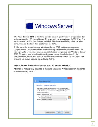 Este documento describe los pasos para instalar y configurar Windows Server 2012 R2 en una máquina virtual usando VirtualBox. Explica cómo crear la máquina virtual, instalar el sistema operativo, instalar VirtualBox Additions para habilitar funciones adicionales, y configurar una carpeta compartida entre la máquina anfitriona y la máquina virtual.
