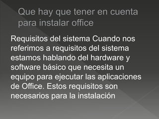 El documento lista los requerimientos generales que necesitan los sistemas operativos relacionados con la arquitectura del computador, incluyendo espacio mínimo en disco duro, cantidad de memoria RAM, velocidad del microprocesador y adaptador de video. También describe los requisitos de hardware y software necesarios para ejecutar aplicaciones de Office como una tarjeta gráfica DirectX 10, procesador de al menos 1GHz, 1GB de RAM para 32 bits y 2GB para 64 bits, y sistemas operativos Windows Vista SP2 o superior, con 1GB de RAM