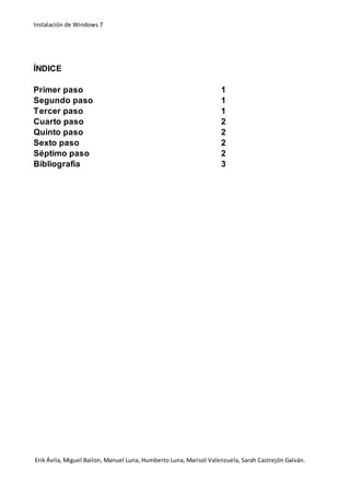 El documento describe los 7 pasos para instalar Windows 7 en una computadora. Primero se entra al BIOS para configurar la fecha, hora e idioma. Luego se aceptan las condiciones de uso y se formatea el disco duro eligiendo el tamaño total. Más adelante se crea un nombre de usuario, contraseña y zona horaria. Finalmente, Windows se instala automáticamente en aproximadamente 15-20 minutos.